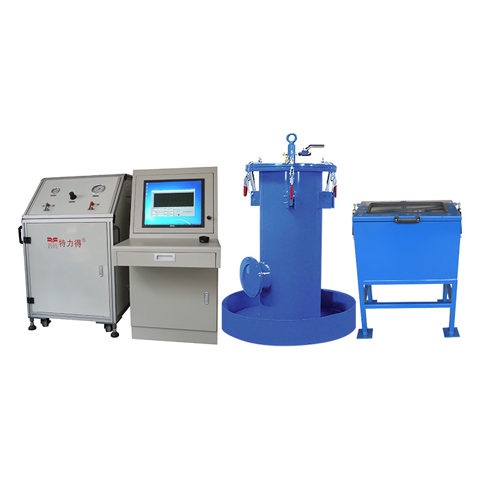 It is newly developed testing equipment. The one piece type combines the high pressure fluid components, electrical components and a printer in the metal frame with removable pate around it. There is a drawer with a printer in it. And the two-piece type consists of a hydraulic testing cabinet and a computer cabinet. Users can select as preferred. In addition, there is a big and small water jacket, a anti-burst testing box. The equipment uses the air as the power supply, air driven pumps as the pressure source. The output hydraulic pressure is proportional to the driven air pressure. By adjusting driven air pressure, it can obtain the corresponding output gas/liquid pressure. When the driven air pressure equals to the outlet pressure, the pump shuts off at a set pressure. The output fluid pressure will be hold in a set pressure. The flow is controlled by controlling the gas input to regulate the pressure increasing rate. After the vessel is deformed, the remains deformation rate can be counted from the weight of water spilled from the jacket.